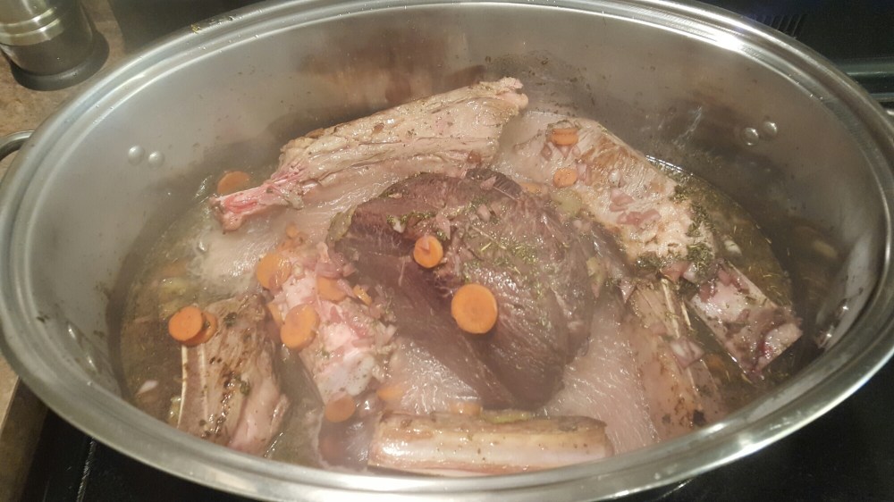 I’ve defrosted the roast. And started the marinade. I am taking the 24hr marinade route, as Julia suggests a few. Even one with the marinade ingredients simply added to the braising process. But I’d like to taste the difference. So every few hours I twirl the roast in the juices of red wine, brandy, olive oil. Seasoned with garlic, thyme, Bay leaves, parsley, salt and pepper. Soaking with celery, carrots and onions.